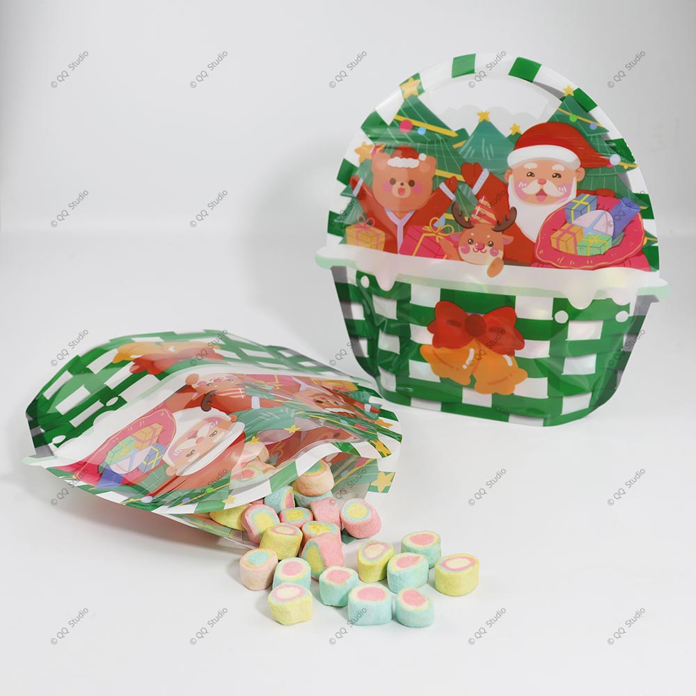 QQ Studio basket shaped Christmas stand up bag makes a great statement about the holiday season(3396). With a handle and clear bottom, this bag has the following features: