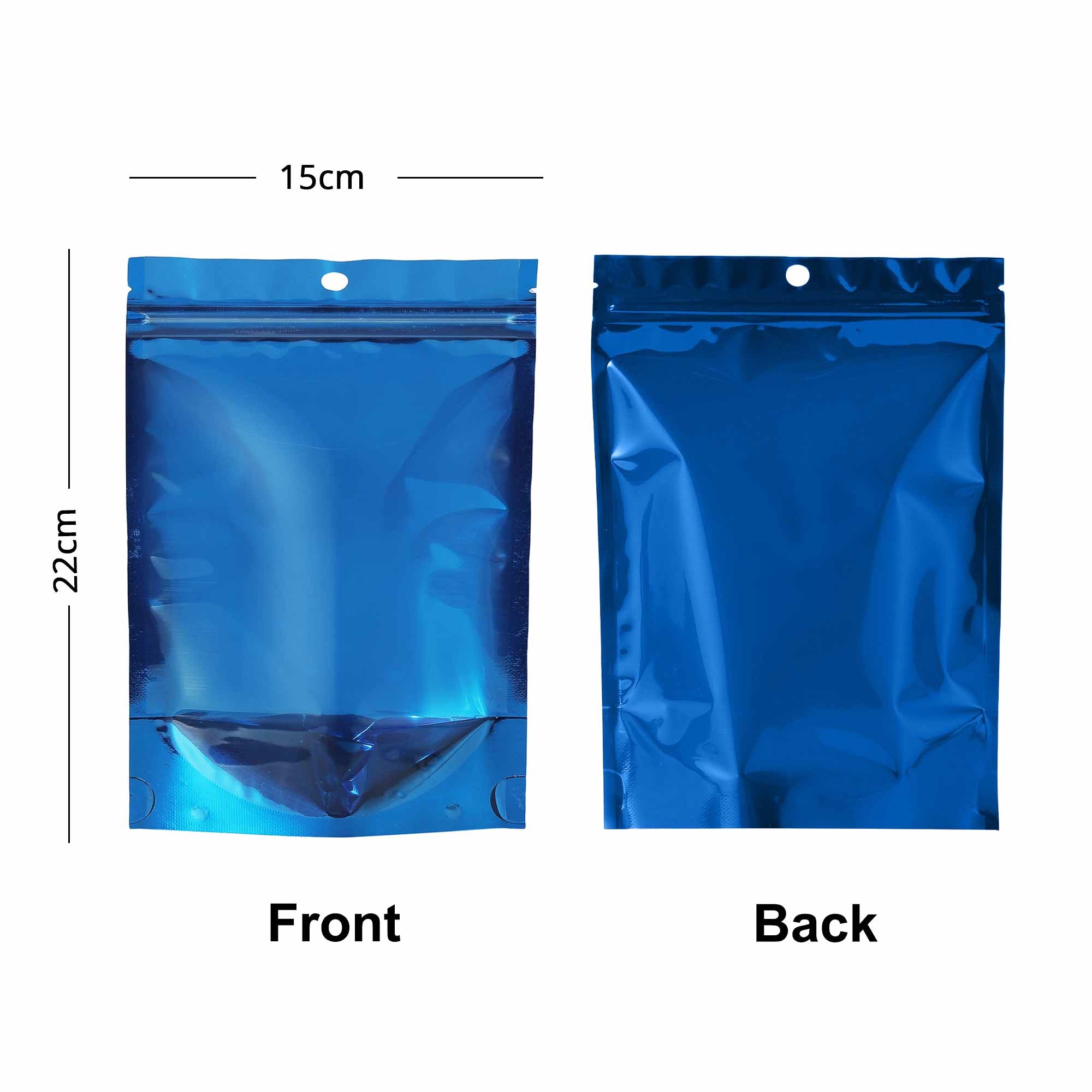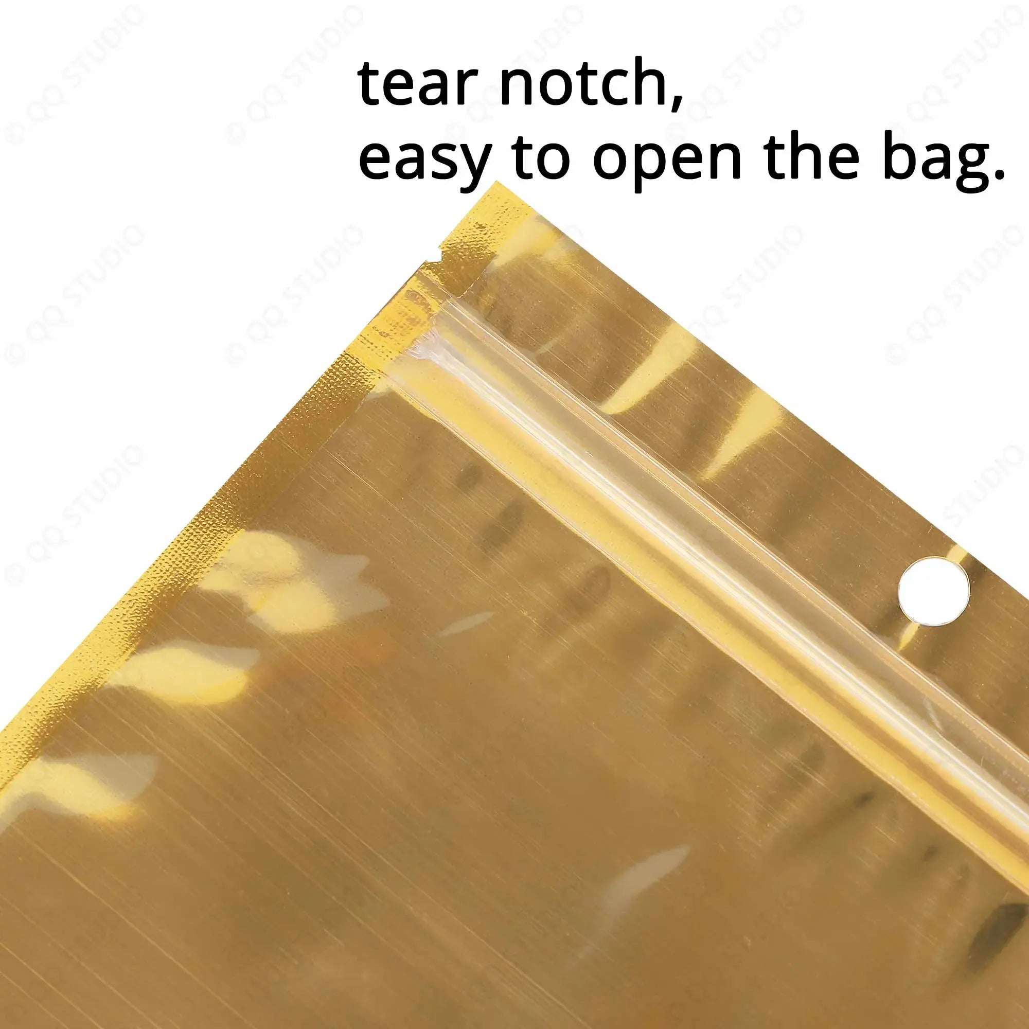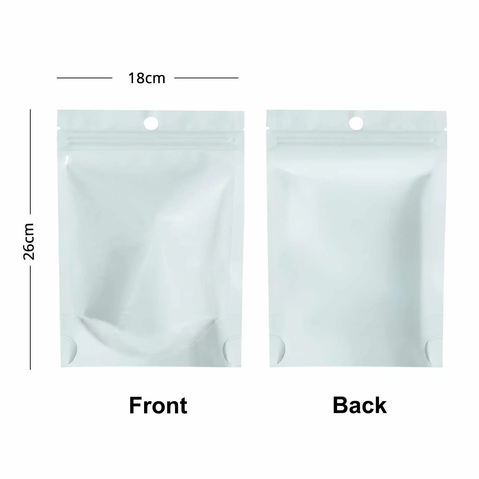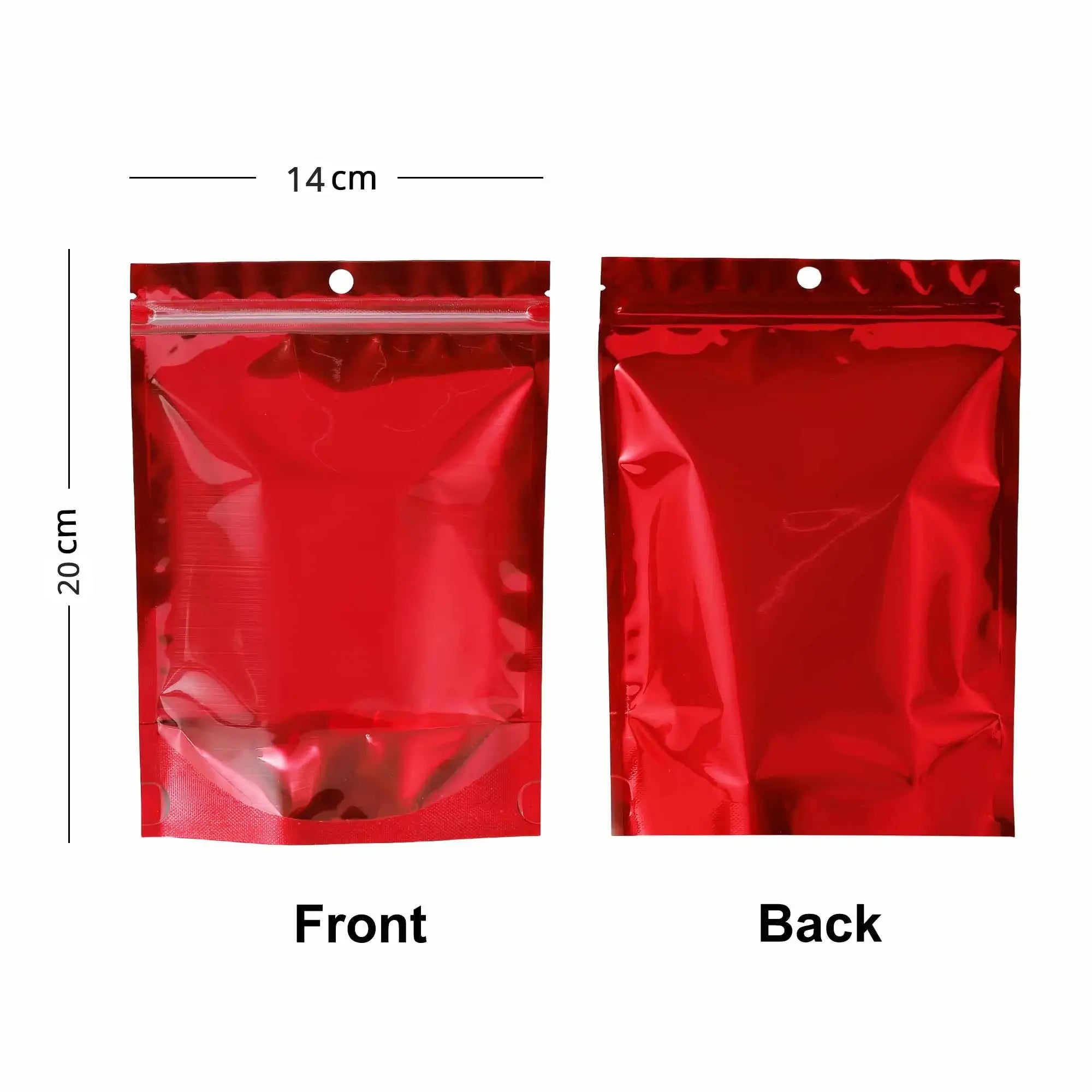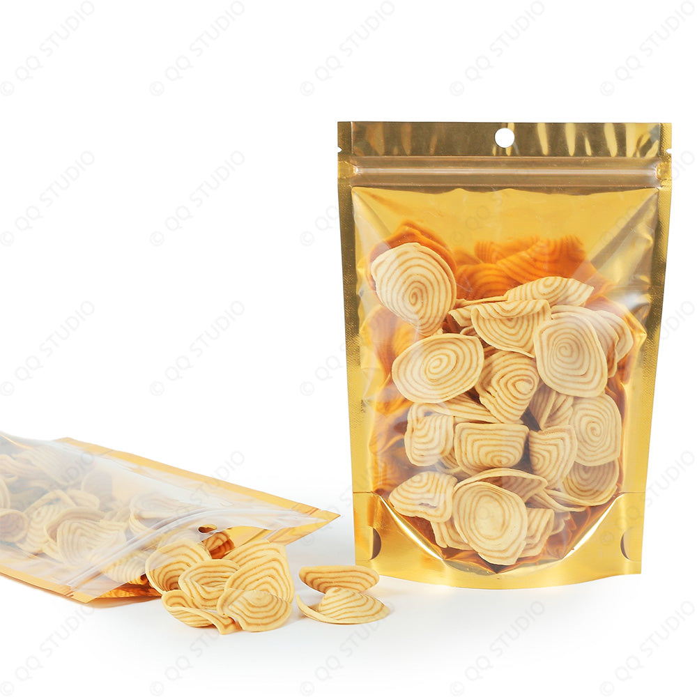 "Our custom printed glossy clear front color back mylar stand upward pouch(CPO-3305-1Kpcs) comes with a convenient hole to raise brand awareness. Features are as follows: